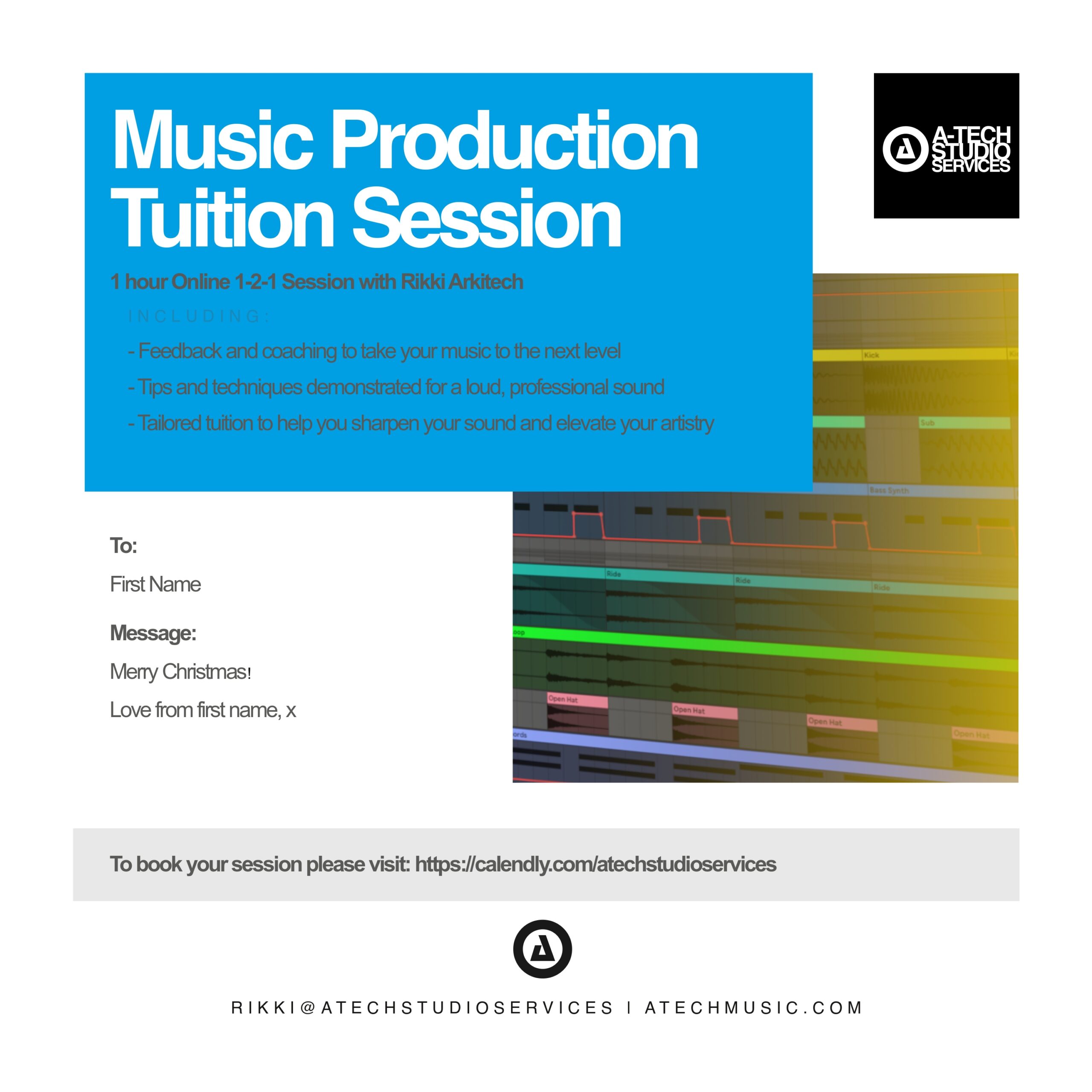 Whether you’re just getting started or refining advanced techniques, Rikki tailors each session to your skill level and goals. Tuition is available using Logic Pro or Ableton Live, but all lessons are explained in a way that can be adapted to any DAW or plugin setup.